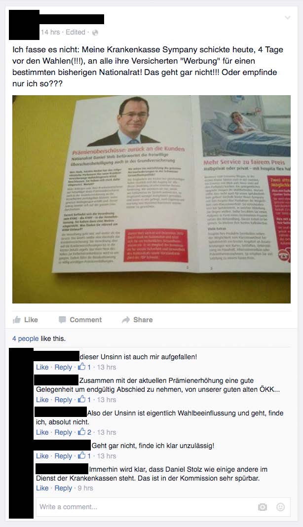 Dass ausgerechnet wenige Tage vor den Wahlen im Magazin von «Sympany», das 130’000 Versicherte erhalten, ein derart prominent platziertes Interview mit Stolz erscheint, kommt bei manchen Kunden gar nicht gut an. Für sie ist klar: Die Versicherung macht damit Wahlwerbung für Stolz. Auf Facebook wird das Vorgehen der 2008 privatisierten Versicherung kritisiert: