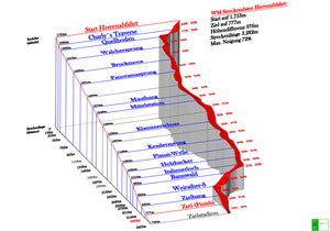 Die 3,282 Kilometer lange WM-Abfahrtsstrecke der Männer auf der Planai: Start auf 1753 Metern (Ziel: 777), Höhendifferenz: 976 Meter, maximale Neigung: 72 Prozent.