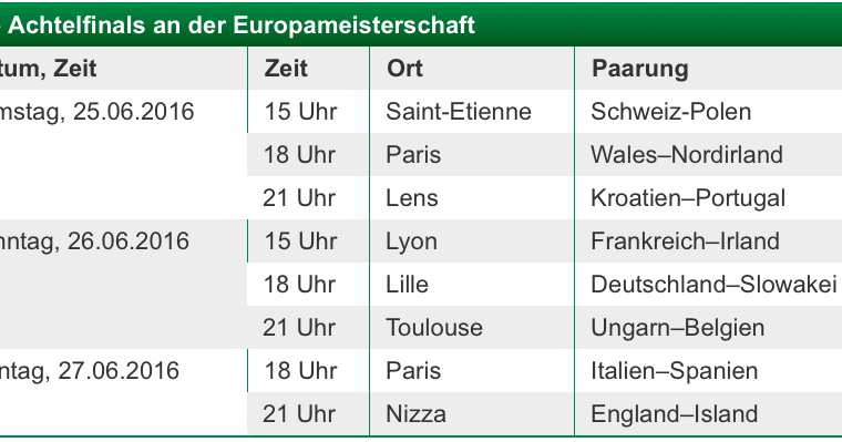| Sonntag, 26.06. | 15 Uhr | Lyon | Frankreich–Irland |