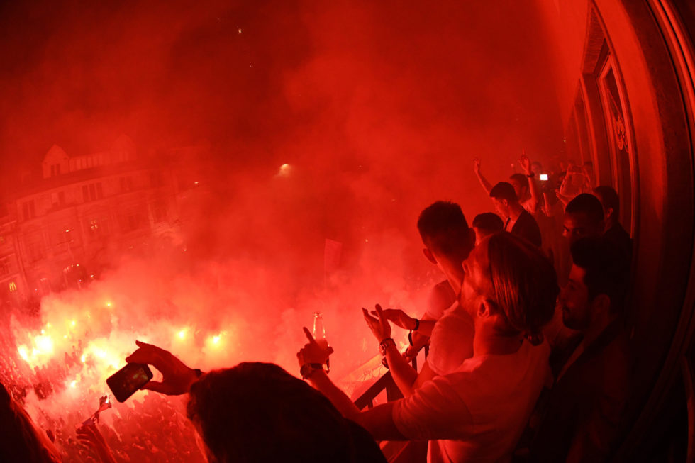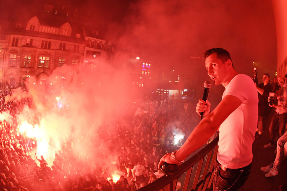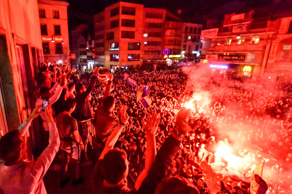 Pyros und Dampf – die übliche Szenerie, wenn die Fans ihren FC Basel auf dem Bafüsserplatz feiern.