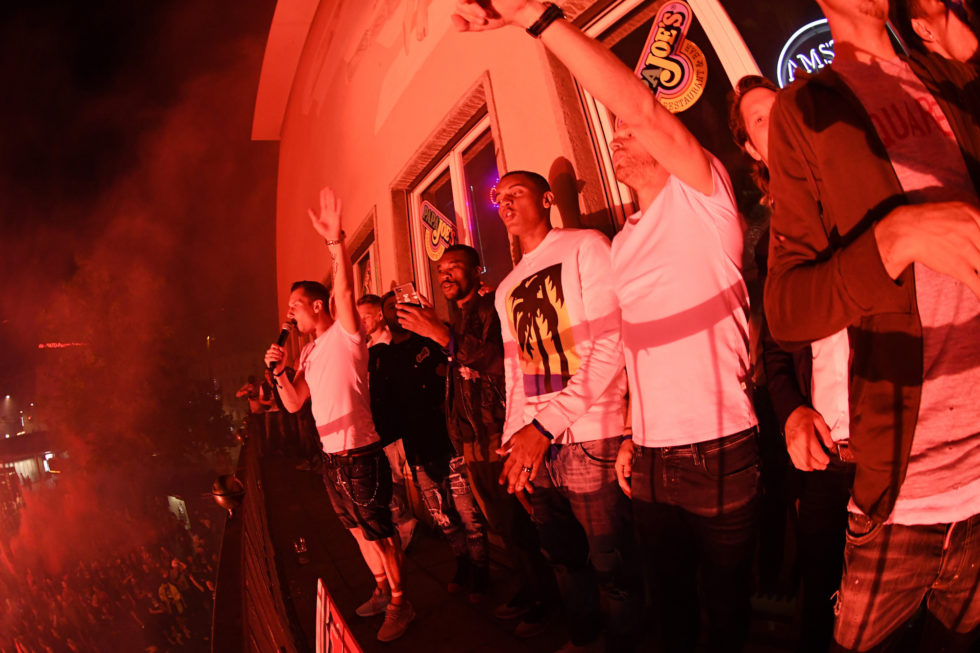 Die FCB-Spieler auf dem Casino-Balkon.