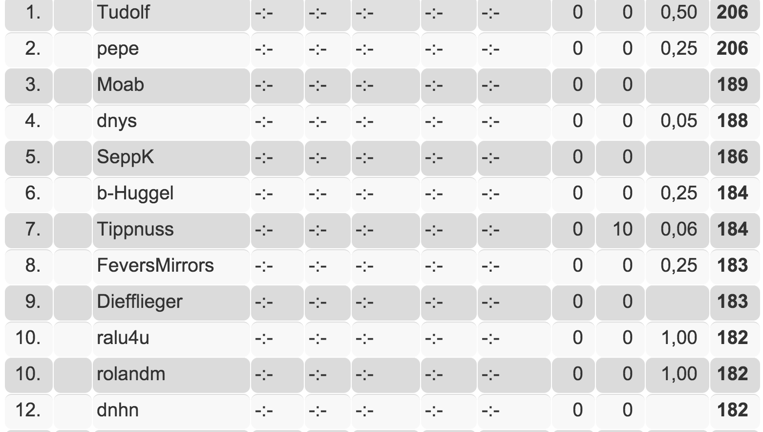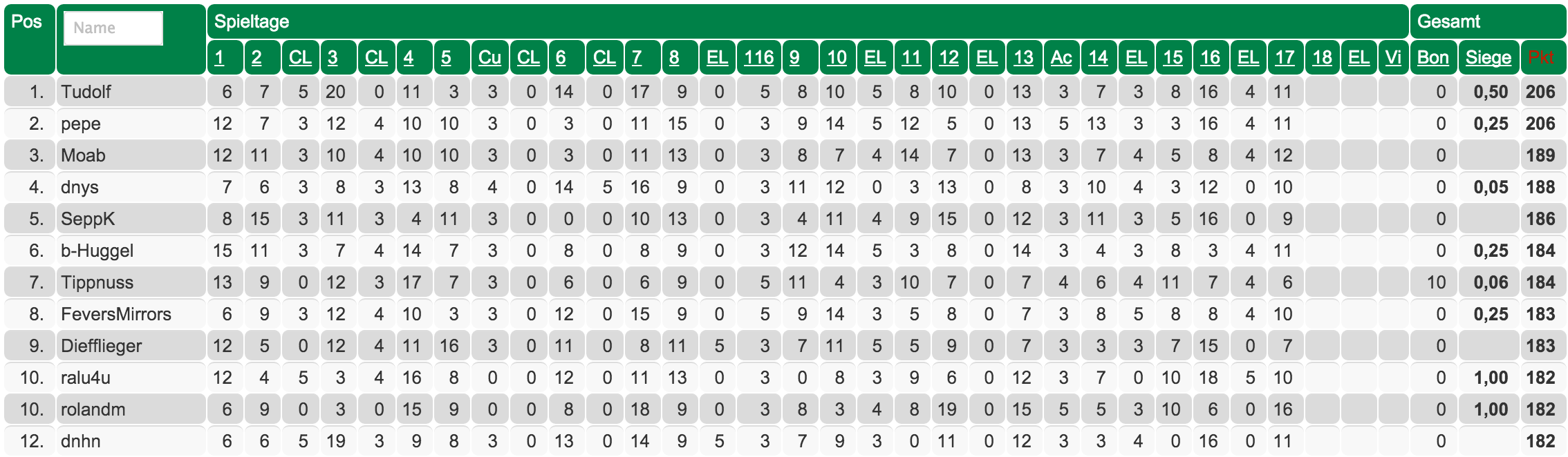 Was es über das Schicksal einiger geschätzter Mittipper zu sagen gibt? Nun, Ersatzinger hat seinen Umzug nach Zürich ebenso teuer bezahlt wie Ex-Namensgeber Florian Raz, der zwar weiter in Basel wohnt, sich aber von Zürich aus bezahlen lässt. Lange mischten sie oben mit, nun rangieren sie mit jeweils 178 Punkten auf den Plätzen 17 und 18.