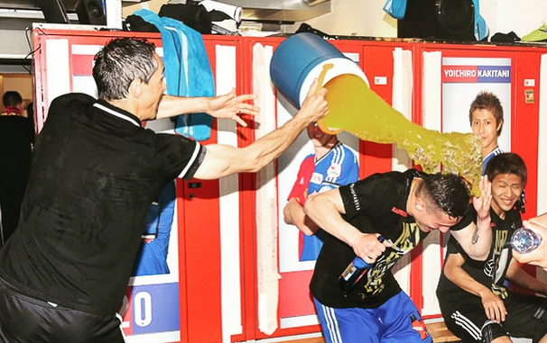 Kabinen-Derwisch: Paulo Sousa macht bei der Meisterfeier kurzen Prozess mit Taulant Xhaka, rechts daneben Yoichiro Kaiktani. (Bild: instagram.com/fcbasel1893_offiziell/)
