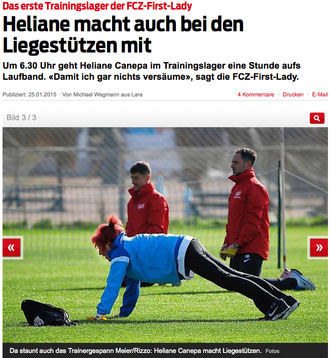 Nach Ancillos legendärer Elfmeter-Show zu San Siro hat sich seine Frau Heliane nun im Trainingslager in der Türkei ins Zeug gelegt mit aktiver Anteilnahme am gymnastischen Programm der Profis. Vornehm zurückhaltend sieht anders aus. Die Canepas könnten eigentlich nur noch ausgestochen werden, wenn die Rihs-Brüder mit den Young Boys an der Tour de Suisse aufs Velo steigen würden.