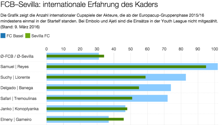 Im Vergleich zu den Andalusiern, den Europa-League-Siegern der letzten beiden Jahre, befindet sich der FC Basel in dieser Hinsicht auf Augenhöhe. Vor dem Achtelfinal-Hinspiel hat ein FCB-Spieler im Durchschnitt 31,2 Partien in internationalen Cupwettbewerben bestritten, wenn man all diejenigen mitzählt, die ab der Europacup-Gruppenphase 2015/16 mindestens einmal in der Startelf standen.