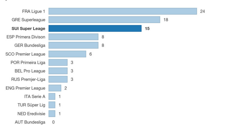 Zugegeben, man muss tief graben in den Datenbanken des europäischen Fussballs, damit man die Super League in einer Grafik an die europäische Spitze bringt. Aber es ist möglich: In keiner anderen Liga haben derart wenige Teams ein positives Torverhältnis. In der Zehnerliga sind es gerade mal die ersten drei Teams Basel, GC und YB. Die relativen Zahlen sprechen die gleiche Sprache: