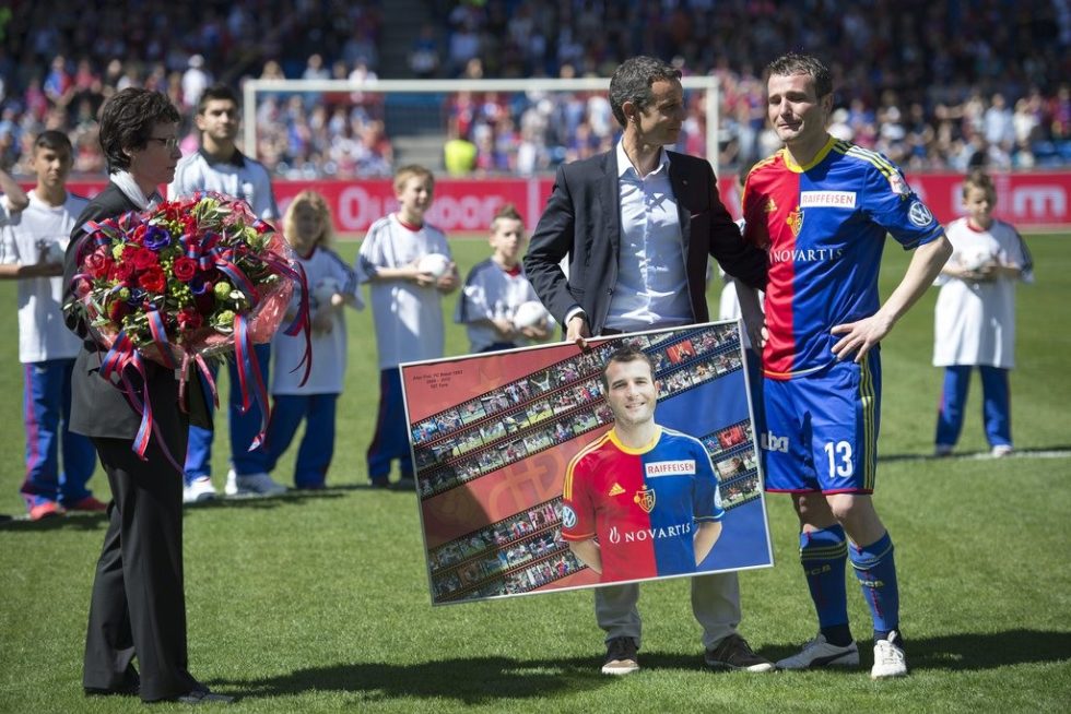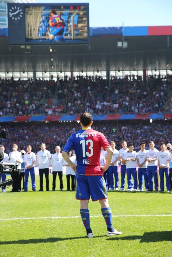 Doch das tut sie nicht. Sie ist da, als auf der Grossleinwand sechzehn Jahre Profikarriere auf drei Minuten komprimiert vorüberziehen: Tore, Tore, Trophäen und noch einmal Tore. Frei hat Tränen in den Augen. Er weint, als er von Heusler ein Poster mit den «schönsten Bildern» (Zitat Heusler) aus seiner Zeit beim FCB erhält.
