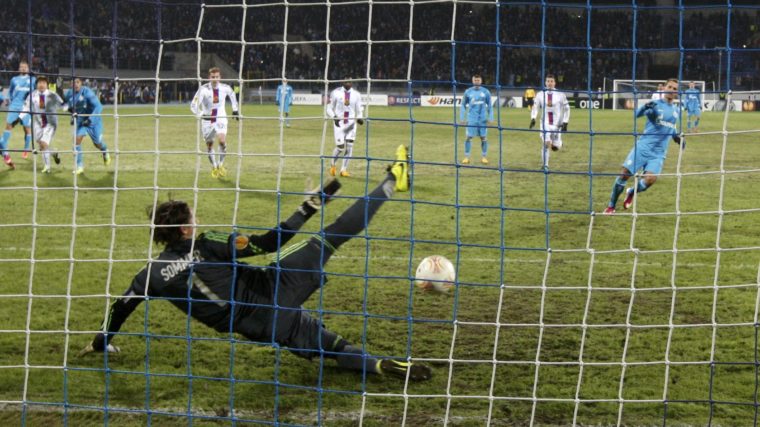 Es legt sich den Ball bereit – nein, nicht Hulk. Obwohl ihm zugetraut werden kann, dass er den Ball bei einem Elfmeter ohne Federlesens einfach mit dem gegnerischen Goalie zusammen durchs Netz hindurch dreschen könnte. Es ist Roman Schirokow, die Nummer 15 des russischen Meisters.