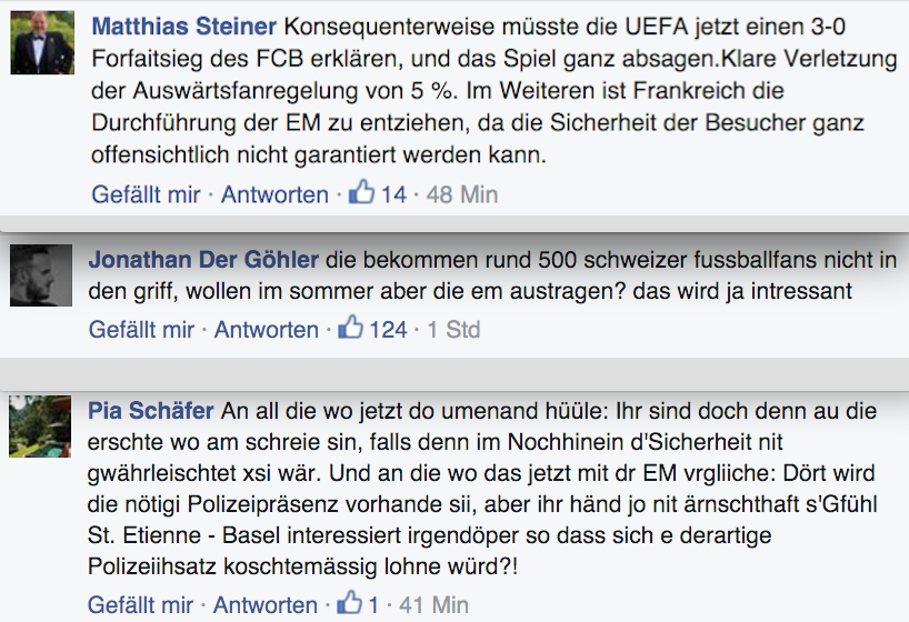 Der Verein rät seinen Anhängern, nicht nach Saint-Etienne zu reisen. Auch deshalb nicht, weil «alle Personen, die als Fans des FC Basel in Saint-Etienne erkannt werden, Gefahr laufen, mit strafrechtlichen Konsequenzen wegen Missachtung einer amtlichen Weisung rechnen zu müssen». Für gekaufte Tickets erstatte die AS Saint-Etienne den Kaufpreis zurück.