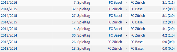 Die Basler Dominanz im ewigen Duell hat noch nicht ganz die Dimension erreicht jener schwarzen Serie, die im Frühjahr 2007 ihren Lauf nahm und erst nach 21 Spielen (inklusive zweier Cup-Begegnungen) ohne Zürcher Erfolg gegen Basel im Sommer 2011 endete. In den 49 Super-League-Begegnungen seit 2003 lautet die Siegbilanz 30:6 für den FCB (bei 13 Remis).