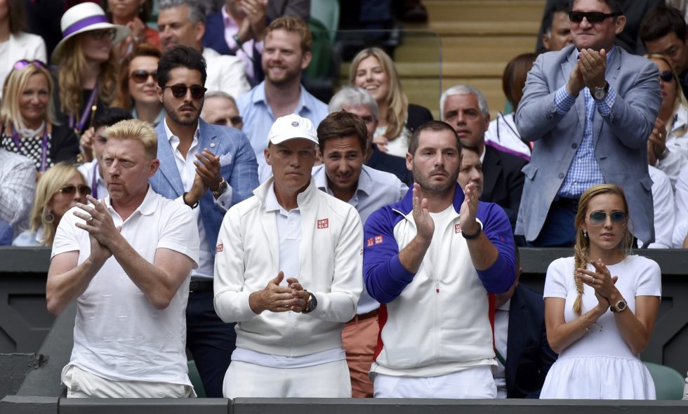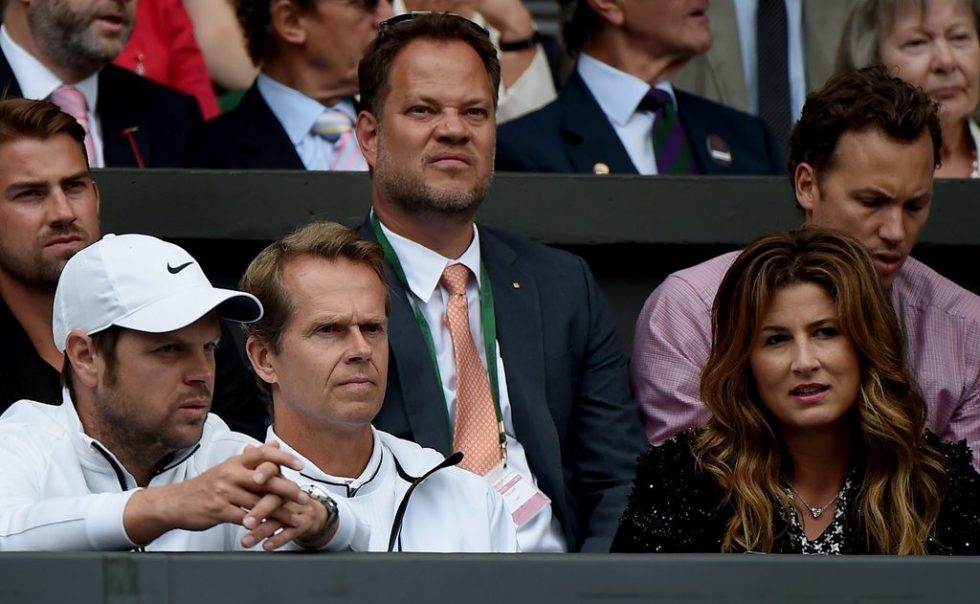 epa04843755 Swiss Roger Federer's wife Mirka (R) and Swedish coach Stefan Edberg (C) react prior to the final match against Novak Djokovic of Serbia during the Wimbledon Championships at the All England Lawn Tennis Club, in London, Britain, 12 July 2015. EPA/ANDY RAIN EDITORIAL USE ONLY/NO COMMERCIAL SALES