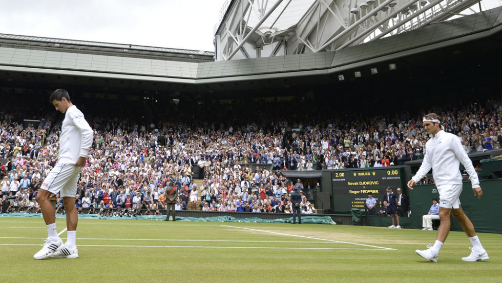Novak Djokovic of Serbia, left, and Roger Federer of Switzerland walk onto Centre Court ahead of the men's singles final at the All England Lawn Tennis Championships in Wimbledon, London, Sunday July 12, 2015. (Toby Melville/Pool Photo via AP)