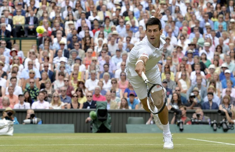epa04843817 Novak Djokovic of Serbia in action against Roger Federer of Switzerland during their final match for the Wimbledon Championships at the All England Lawn Tennis Club, in London, Britain, 12 July 2015. EPA/ANDY RAIN EDITORIAL USE ONLY/NO COMMERCIAL SALES