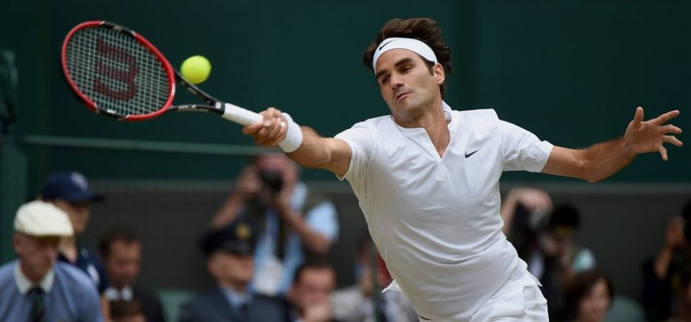 epa04843819 Roger Federer of Switzerland in action against Novak Djokovic of Serbia during their final match for the Wimbledon Championships at the All England Lawn Tennis Club, in London, Britain, 12 July 2015. EPA/ANDY RAIN EDITORIAL USE ONLY/NO COMMERCIAL SALES