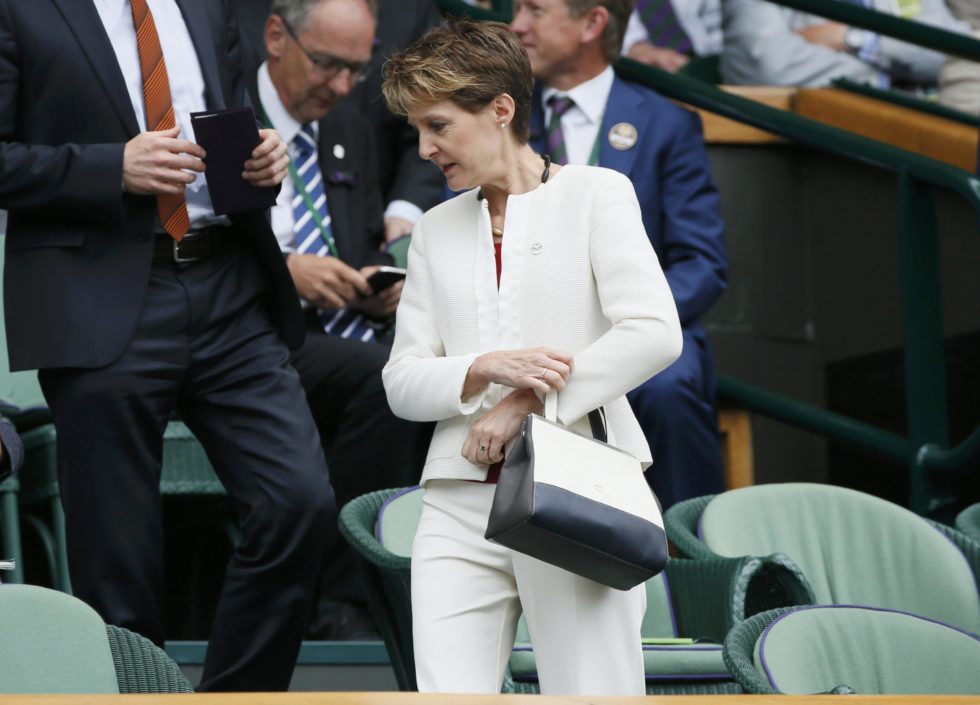 Swiss Federal Councillor Simonetta Sommaruga on Centre Court at the Wimbledon Tennis Championships in London, July 12, 2015. REUTERS/Stefan Wermuth