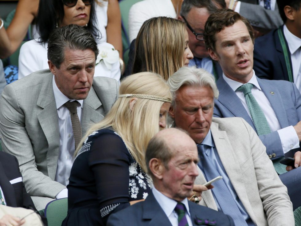 Actor's Benedict Cumberbatch (top R) and Hugh Grant (L), Former Tennis player Bjorn Borg and his wife Patricia on Centre Court at the Wimbledon Tennis Championships in London, July 12, 2015. REUTERS/Stefan Wermuth