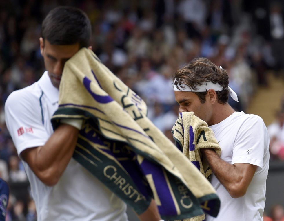 Novak Djokovic of Serbia and Roger Federer of Switzerland wipe their face during their Men's Singles Final match at the Wimbledon Tennis Championships in London, July 12, 2015. REUTERS/Toby Melville