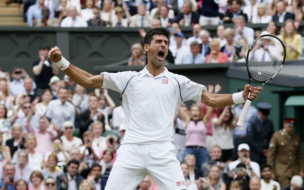 Novak Djokovic of Serbia celebrates after winning his Men's Singles Final match against Roger Federer of Switzerland at the Wimbledon Tennis Championships in London, July 12, 2015. REUTERS/Stefan Wermuth