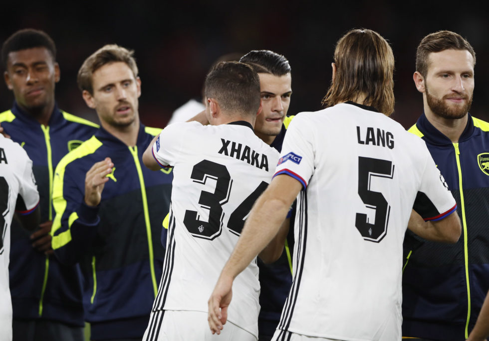 Britain Soccer Football - Arsenal v FC Basel - UEFA Champions League Group Stage - Group A - Emirates Stadium, London, England - 28/9/16 FC Basel's Taulant Xhaka shakes hands with Brother Granit Xhaka of Arsenal Action Images via Reuters / Andrew Couldridge Livepic EDITORIAL USE ONLY.