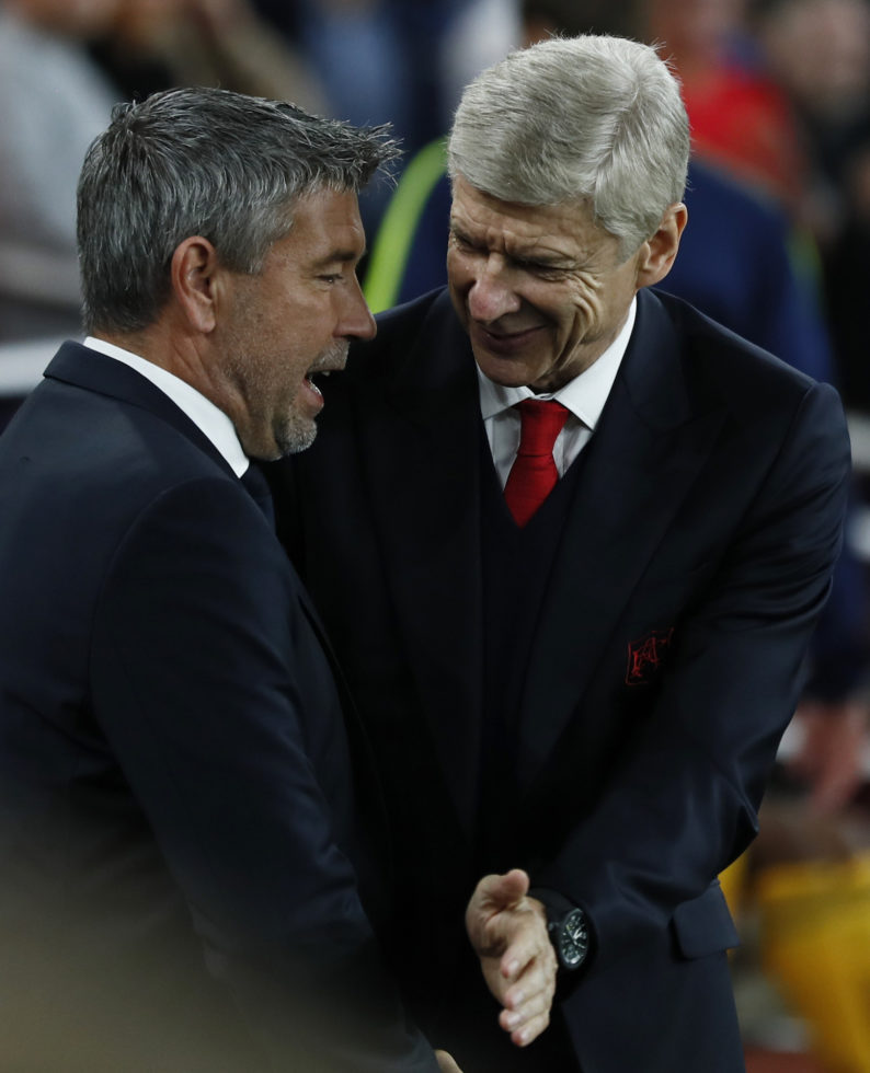 Britain Soccer Football - Arsenal v FC Basel - UEFA Champions League Group Stage - Group A - Emirates Stadium, London, England - 28/9/16 Arsenal manager Arsene Wenger shakes hands with FC Basel coach Urs Fischer before the match Reuters / Stefan Wermuth Livepic EDITORIAL USE ONLY.