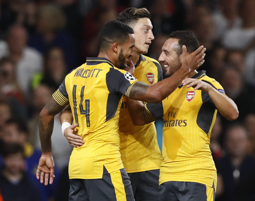 Britain Soccer Football - Arsenal v FC Basel - UEFA Champions League Group Stage - Group A - Emirates Stadium, London, England - 28/9/16 Arsenal's Theo Walcott celebrates scoring their second goal with teammates Reuters / Stefan Wermuth Livepic EDITORIAL USE ONLY.