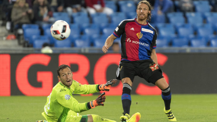 Der Basler Michael Lang, rechts, erzielt das 4:0 gegen den Tessiner Torhueter Mirko Salvi, links,im Fussball Meisterschaftsspiel der Super League zwischen dem FC Basel 1893 und dem FC Lugano, im Stadion St. Jakob-Park in Basel, am Samstag, 20. August 2016. (KEYSTONE/Georgios Kefalas)