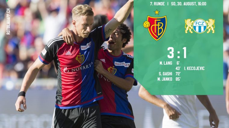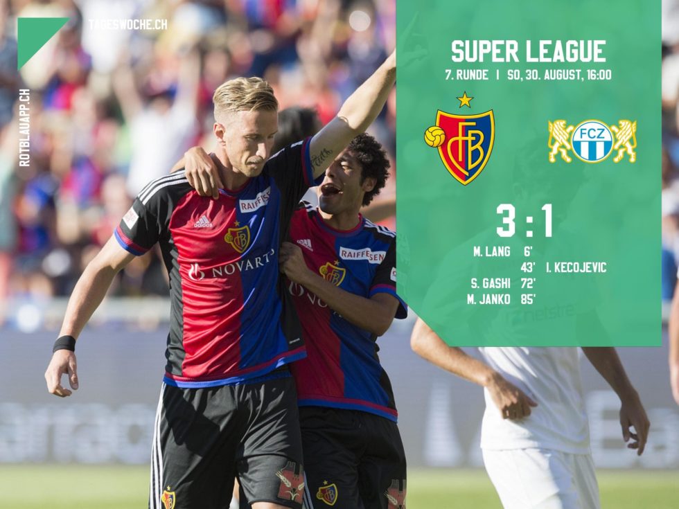 Der FC Basel bleibt auch im siebten Ligaspiel unbestritten. Gegen den FC Zürich reicht eine starke zweite Halbzeit zum 3:1, die Basler Torschützen heissen Lang, Gashi und Janko. Die Partie musste minutenlang unterbrochen werden.