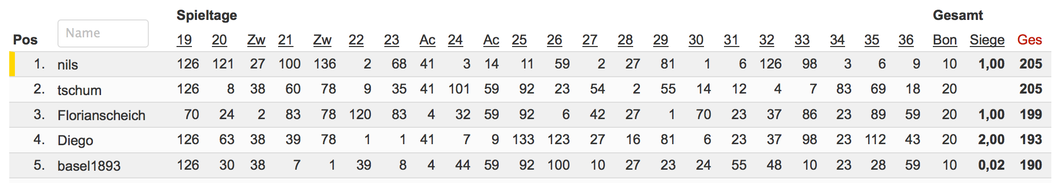 Die Übersicht über die einzelnen Spieltags-Platzierungen, die zur Entscheidung herangezogen werden musste: