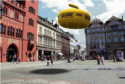 Auch eine Möglichkeit, sich fototauglich zu vermarkten: Visualisierung eines schwebenden Curlingsteins über dem Marktplatz. (Bild: Standortmarketing Basel)