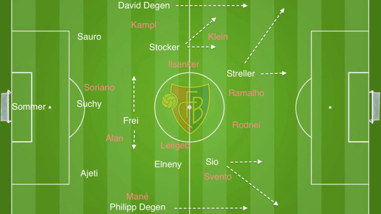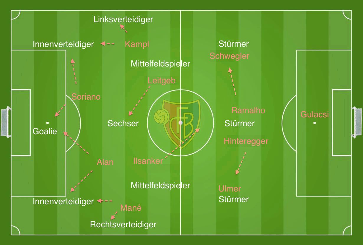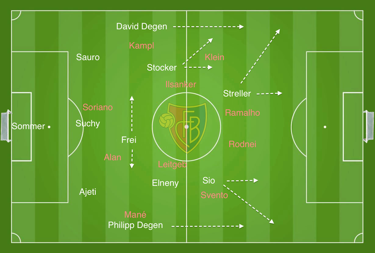 Die Stürmer Soriano und Alan funktionierten als erste Verteidiger ihrer Mannschaft und attackierten die Innenverteidiger so, dass diese sogar Mühe hatten, einen gezielten weiten Ball zu schlagen. Die Flügel Mané und Kampl deckten die Aussenverteidiger ab – und Leitgeb sorgte dafür, dass das Zentrum dicht war.